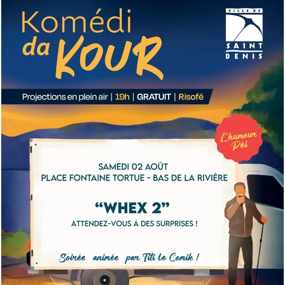 La Ville de Saint-Denis vous invite à ne pas manquer la dernière édition de « Komédi da Kour » ce samedi 2 août à 19h, sur la place Fontaine Tortue au Bas de la Rivière. Pour clôturer cette série de projections en plein air, c’est le film culte “WHEX 2” de Thierry Jardinot qui sera à l’affiche, accompagné de nombreuses surprises.
