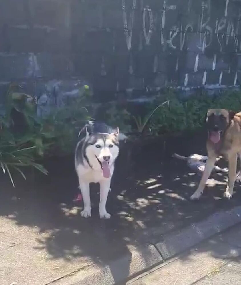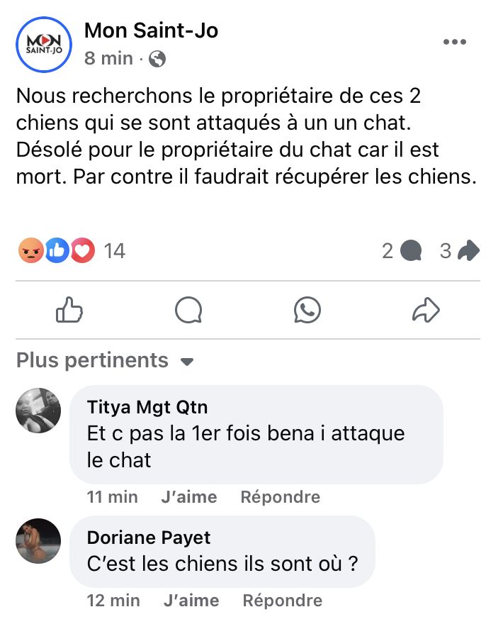 « Nous recherchons le propriétaire de ces 2 chiens qui se sont attaqués à un un chat. Désolé pour le propriétaire du chat car il est mort. Par contre il faudrait récupérer les chiens. »