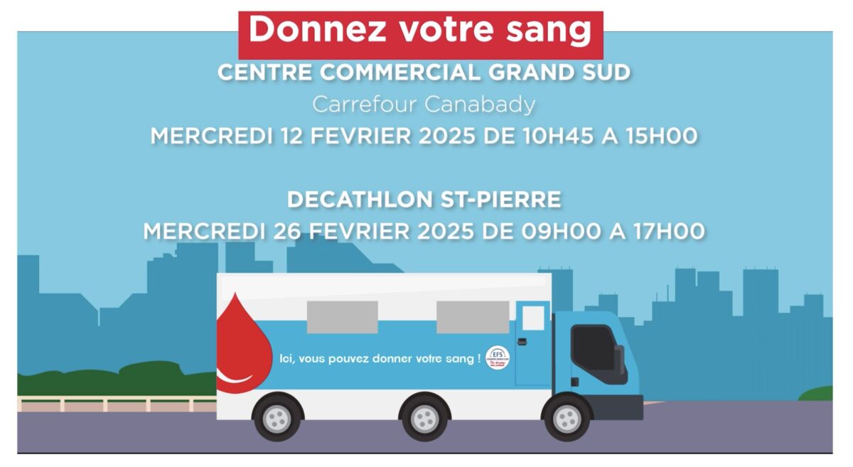 L’Etablissement Français du Sang La Réunion O.I organise deux collectes de dons de sang sur le parking du centre commercial grand sud et décathlon St-Pierre ce 12 février 2025.