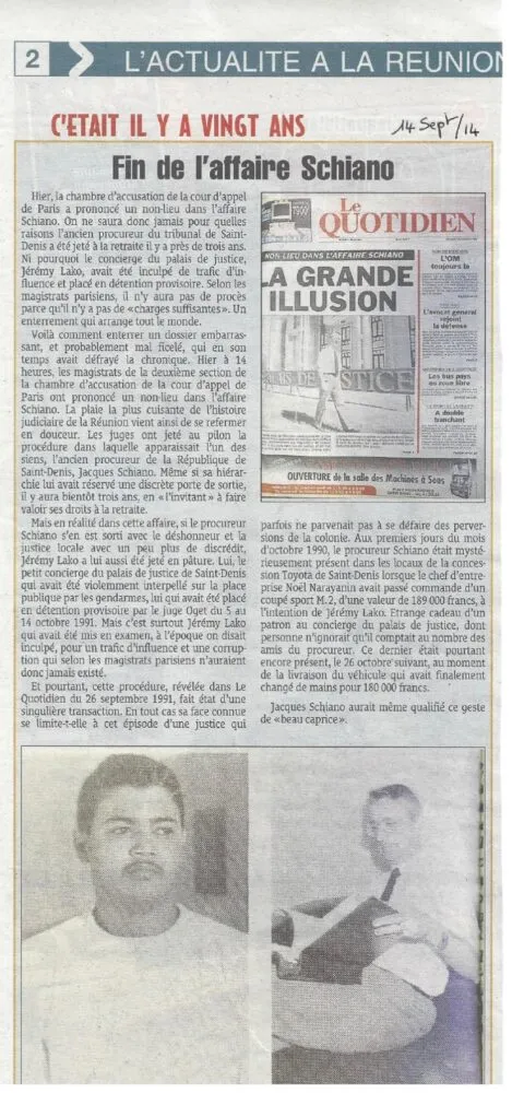 Et ces deux magistrats soupçonnés de corruption est une affaire qui réveille de vieux souvenirs à La Réunion ! Souvenez vous : le 24 février 1991, l’île s’embrasait après la saisie des émetteurs de Télé Free Dom par décision du procureur Schiano. Une mesure qui avait déclenché les violentes émeutes du Chaudron, inscrivant dans la mémoire collective le combat de Camille Sudre pour la liberté d’expression et marquant à jamais l’histoire des médias réunionnais, on se souvient que le journal Le Quotidien en avait parlé :