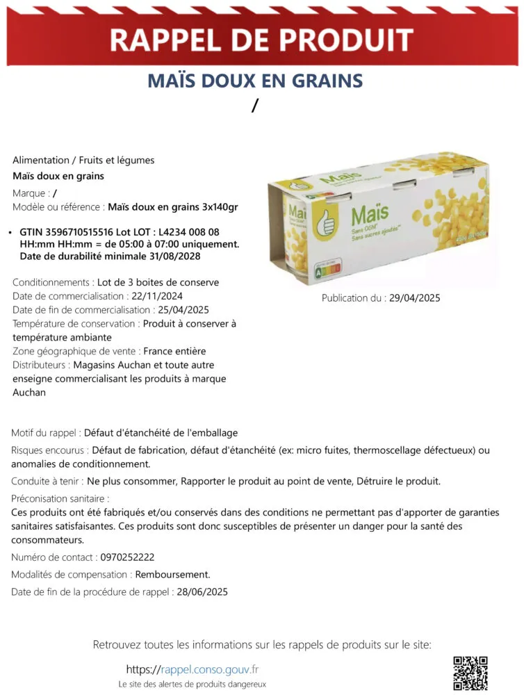 Le premier rappel concerne un maïs doux en grains, vendu sous marque distributeur chez Auchan. Commercialisé à partir de novembre 2024, il est en boîte de 140g par lot de trois. Seules les boîtes produites entre 5h et 7h du matin (oui, c’est précis !) sont concernées. Le défaut de fabrication rend le conditionnement incertain : le maïs pourrait avoir été exposé à l’air et aux bactéries. Si vous en avez chez vous, ne le consommez pas. Rapportez-le en magasin, le remboursement est prévu.