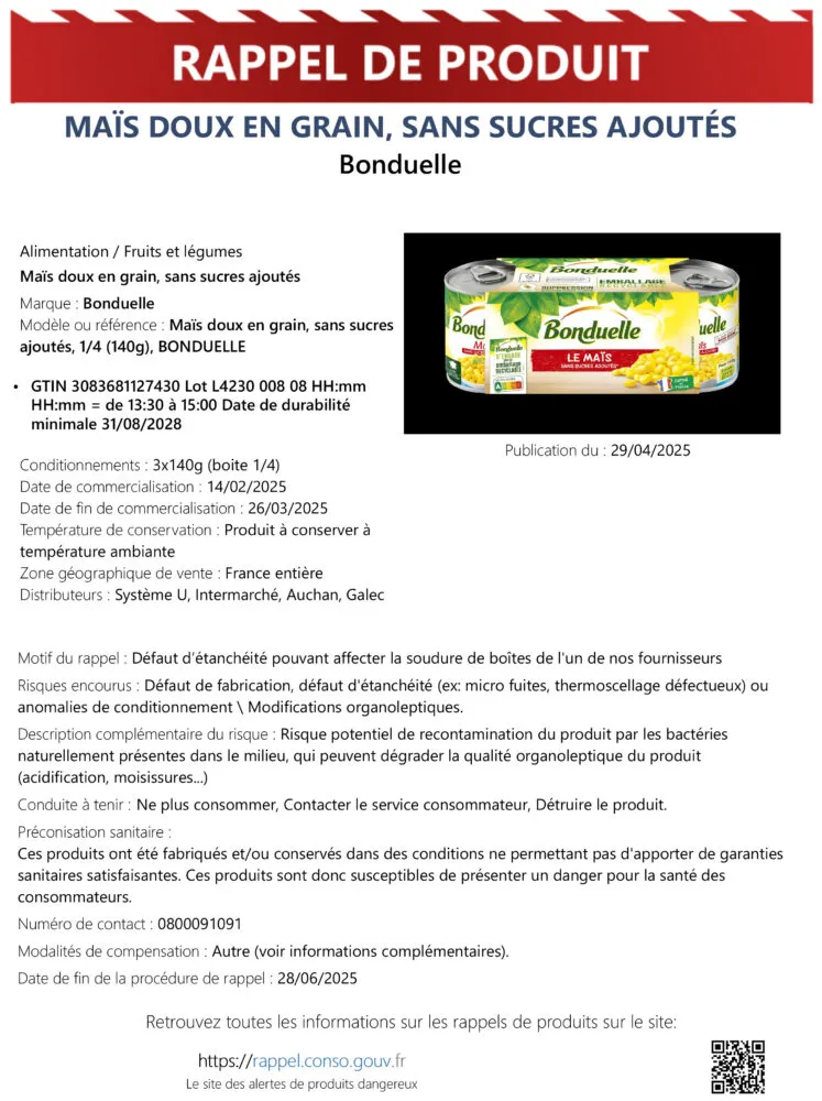 Le second touche le maïs doux sans sucres ajoutés de la marque Bonduelle. Même format (3x140g), mais cette fois vendu chez Intermarché, Système U, Auchan. Les boîtes ont été produites entre 13h30 et 15h. Là aussi, l’étanchéité pose problème, et les risques sont similaires. Bonduelle évoque une éventuelle altération du goût ou de l’odeur, mais surtout, un danger sanitaire réel si le produit est contaminé.