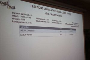 La candidate du Nouveau Front Populaire Karine Lebon victorieuse avec 67,46% des suffrages , face à la candidate du RN Christelle Bègue, qui n’a récolté que 32,54% des suffrages.