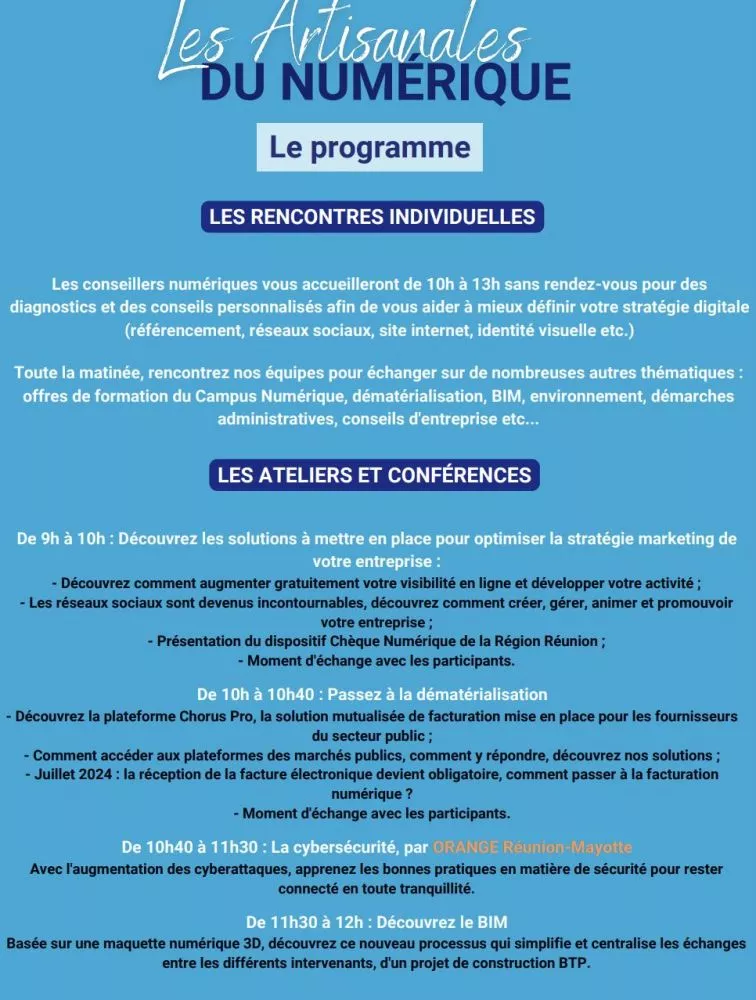 Ateliers sur la cybersécurité, sur la digitalisation, conseils individuels sur la stratégie digitale, les chefs d’entreprise artisanale bénéficieront de l’expertise des conseillers numériques de la CMAR. Vous trouverez ci-joint le programme complet de l’évènement.