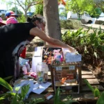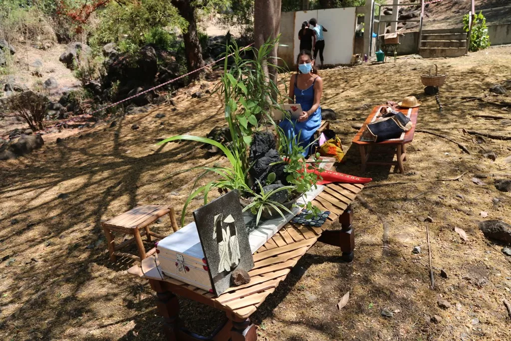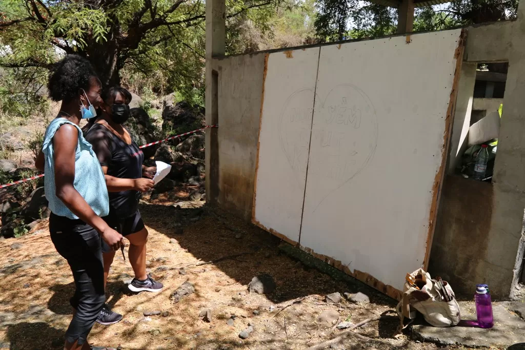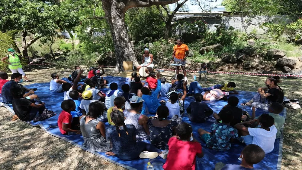 Avant de quitter le parc où Carole et Daniella, « les Sistas Painters » qui se sont rencontrées le matin même, préparent le tableau souvenir de la journée, dernière halte pour tous au stand de maloya avec l’association « 1 2 3 Fanm » et le groupe Zarlor.