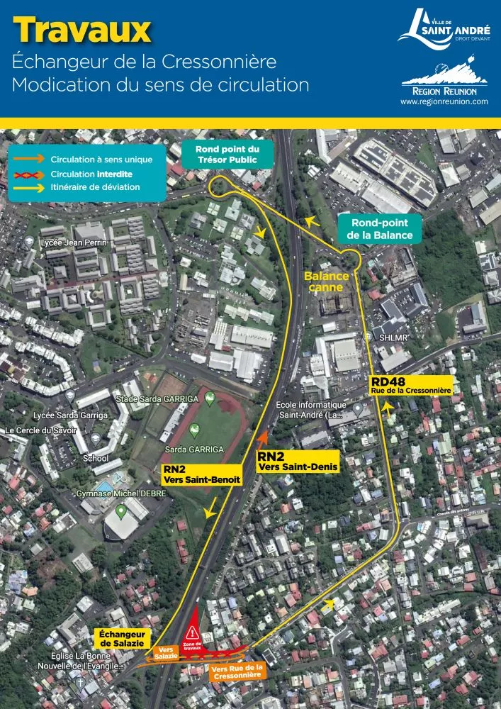 Pour permettre aux usagers de la route de mieux circuler et pour faciliter l’accès à la voie rapide menant à Saint-Denis, l’échangeur de la Cressonnière sera en travaux à partir du lundi 14 mars. Une bretelle d’accès à la route nationale, allant vers Saint-Denis, verra le jour prochainement.