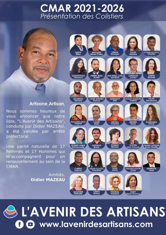 Le candidat de l’Avenir des artisans, Didier Mazeau, a tenu cette semaine une conférence de presse entouré de ses 34 colistier dont 17 femmes et 17 hommes, lui y compris. Didier Mazeau, qui est vice-président de l’exécutif sortant, estime que le « bilan de Bernard Picardo n’est pas au rendez-vous ». Selon lui, « l’actuel président cumule trop de mandats et cela fait longtemps qu’il ne s’occupe plus des artisans ».
