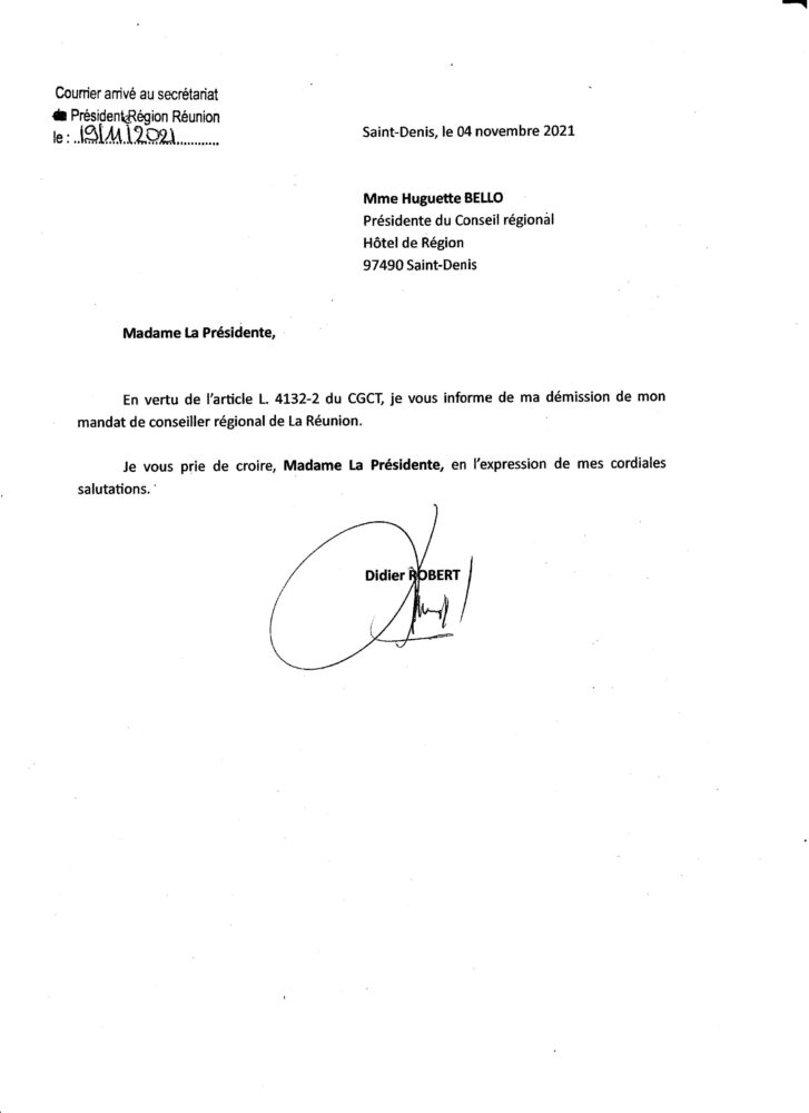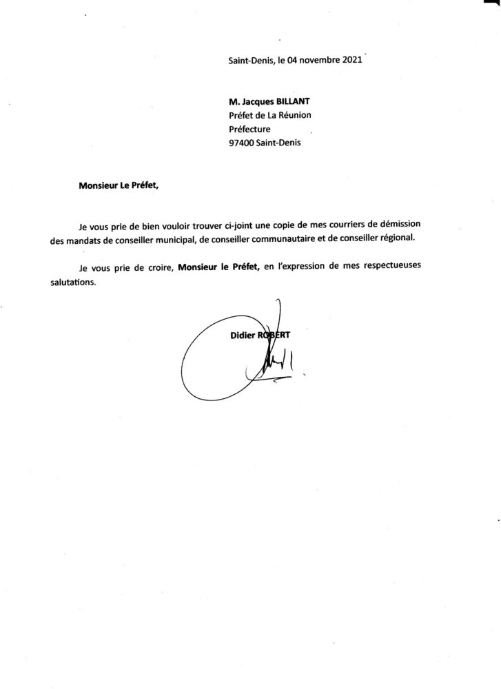 Conformément à ce qu’il avait déclaré à notre journaliste Yves Mont-Rouge lors d’une longue interview réalisée fin octobre à la veille d’une session plénière de la Région, Didier Robert, l’ancien président de la pyramide (2010-2021) a bel et bien démissionné de son mandat de conseiller régional. Sa lettre de démission datée du 4 novembre dernier a été adressée au préfet de la Réunion Jacques Billant ainsi qu’à Huguette Bello, présidente de Région depuis juin dernier.