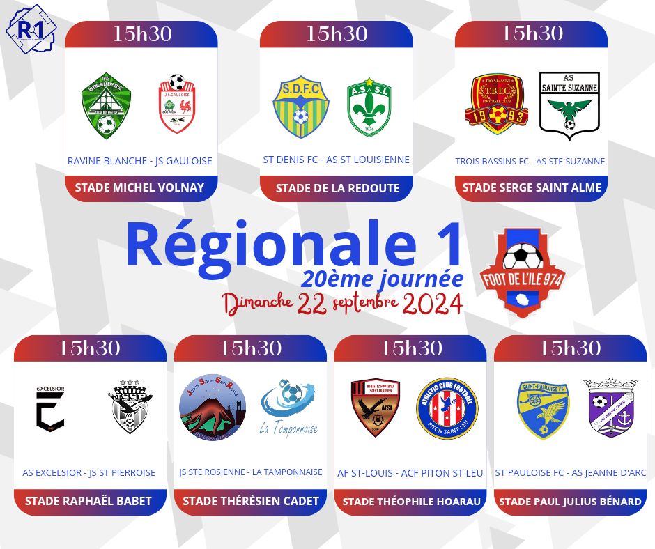 Retrouvez le multiplex dès 15h30 sur notre antenne Free Dom en direct du stade RAPHAEL BABET de Saint-Joseph pour la 20e journée de la Régionale 1 :