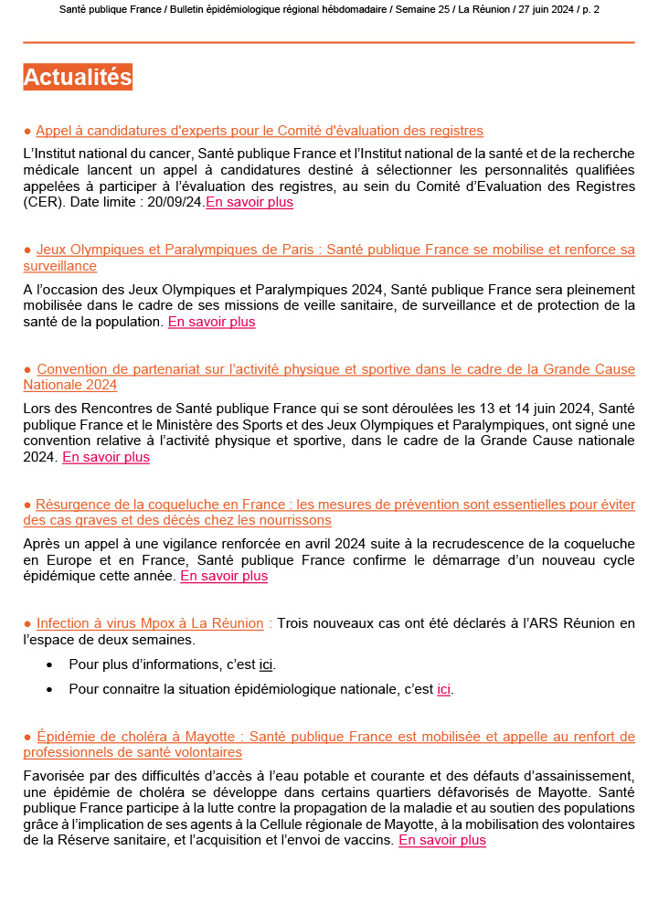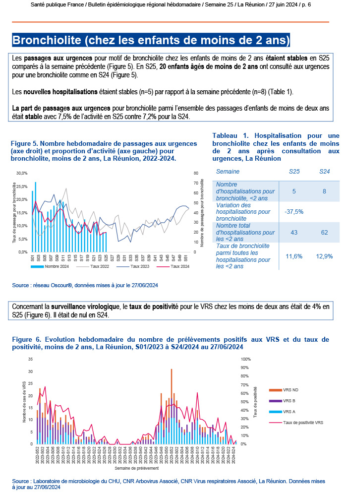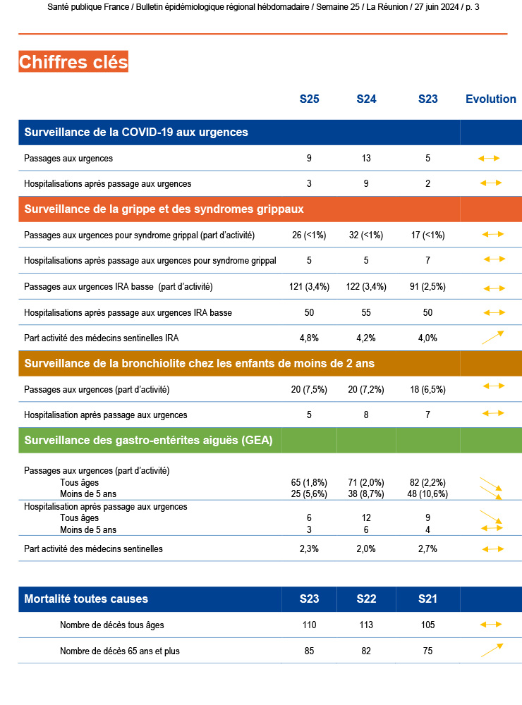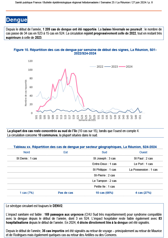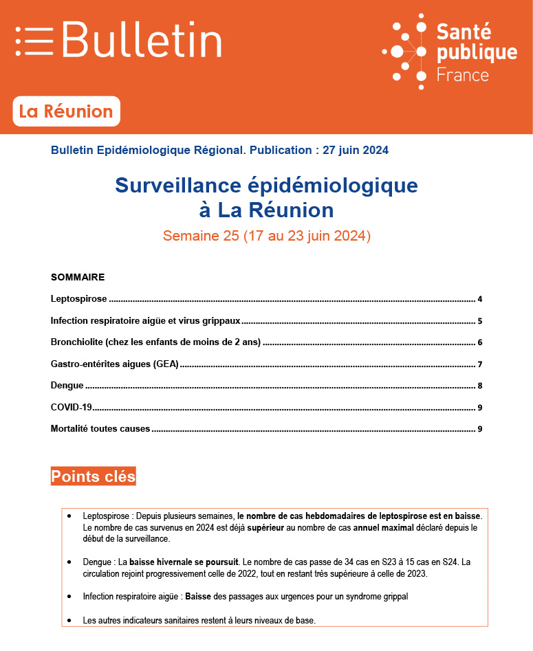 La semaine 25 montre une diminution continue des cas de leptospirose, bien que le total pour 2024 ait déjà dépassé le record annuel. La dengue poursuit sa baisse hivernale avec 15 cas contre 34 la semaine précédente, se rapprochant des chiffres de 2022 mais restant au-dessus de ceux de 2023. Les passages aux urgences pour syndrome grippal sont également en baisse, tandis que les autres indicateurs sanitaires restent stables.