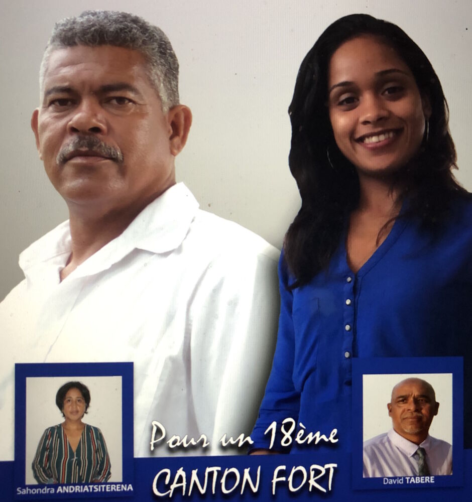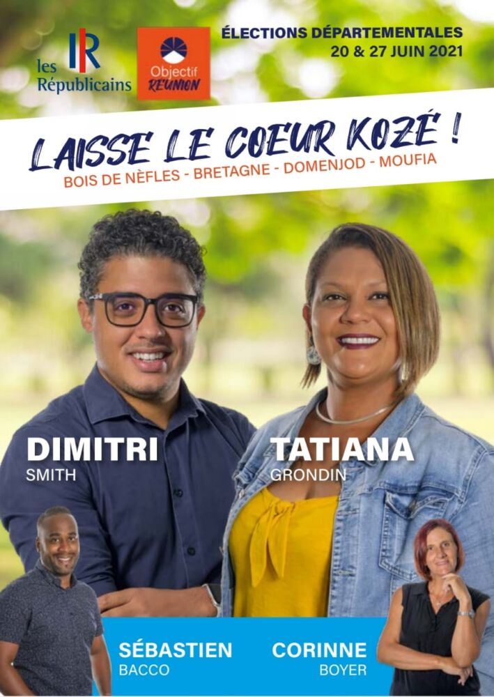 Tatiana Grondin et Dimitri Smith, deux jeunes candidats Les Républicains/Objectif Réunion se présentent sur le canton 12 (Saint Denis 4) regroupant les quartiers du Bois de Nèfles, Moufia, Domenjod et la Bretagne. Leurs suppléants sont Corinne Boyer et de Sébastien Bacco.