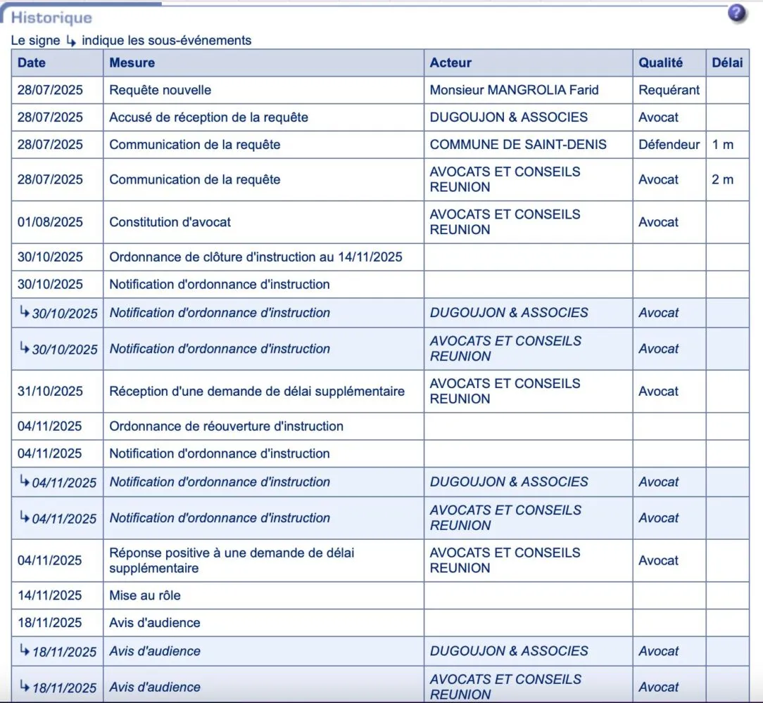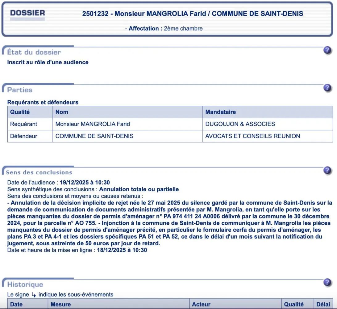 L’audience porte sur un point précis mais central : la non-communication complète du dossier de permis d’aménager par la mairie de Saint-Denis, malgré un avis favorable de la Commission d’accès aux documents administratifs (CADA).