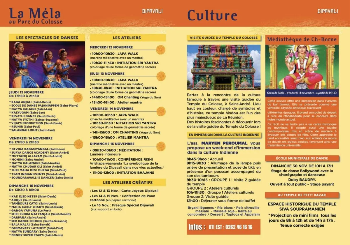 A retenir : l’inauguration du Dipavali 2025 aura lieu le mercredi 12 novembre à partir de 17h30 au parc du Colosse. La mêla indienne, au même endroit, se déroulera du 12 au 16 de 9 heures à 21 heures, avec animations et spectacles divers. Avec possibilité de se restaurer sur place. L’entrée est gratuite à la mêla. Le défilé de chars partira à la tombée de la nuit (aux environs de 18h30) devant la mairie du centre-ville le 15 et s’achèvera au stade Sarda-Garriga avec un grand spectacle et l’incontournable feu d’artifice. Ne pas non plus oublier le Hôli (fête des couleurs) le dimanche 16 novembre à partir de 10h30 au parc du Colosse.