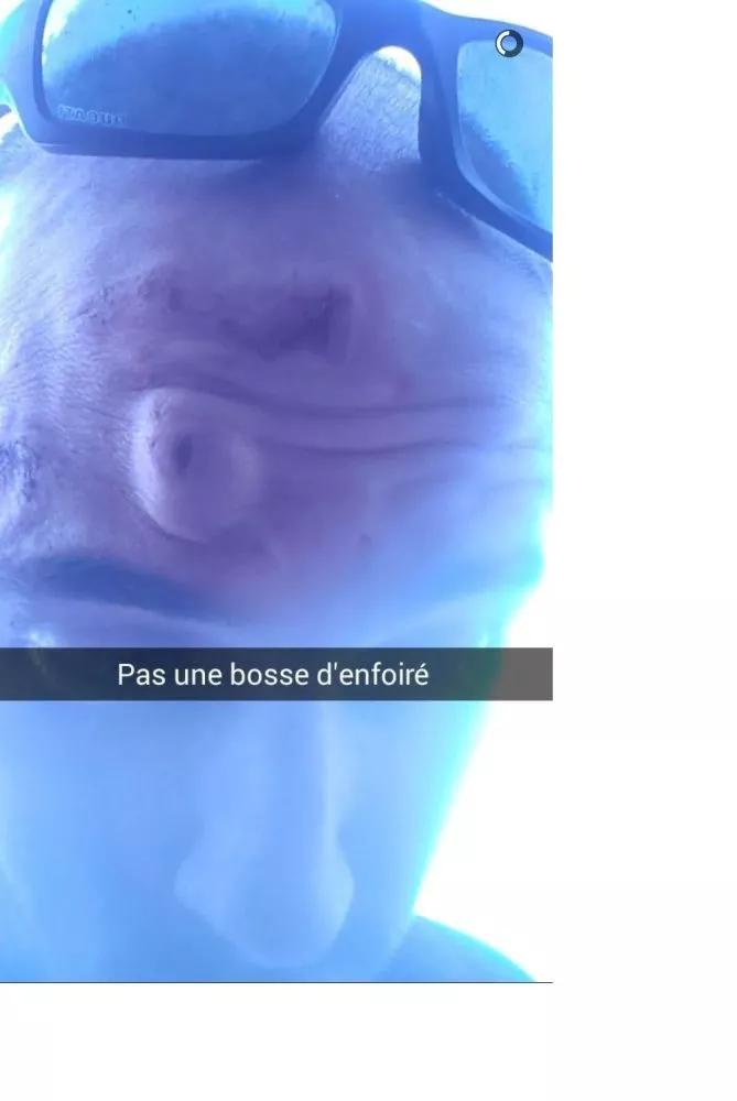 Il s’agit d’un selfie de Mat, envoyé par Snapchat, où l’on voit le jeune gendarme héraultais, avec une énorme bosse sur le front. Sur la photo, il y a une mention, « Pas une bosse d’enfoiré ».