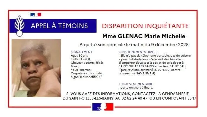 Marie Michelle Glenac fréquente habituellement les secteurs de Saint-Gilles-les-Bains et de Saint-Paul (gare routière, centre-ville, Super U, Savannah). Un dernier passage est évoqué à l’arrêt de bus de Boucan, direction Saint-Paul. Toute information doit être transmise à la gendarmerie de Saint-Gilles-les-Bains (02 62 24 40 47) ou à sa famille.