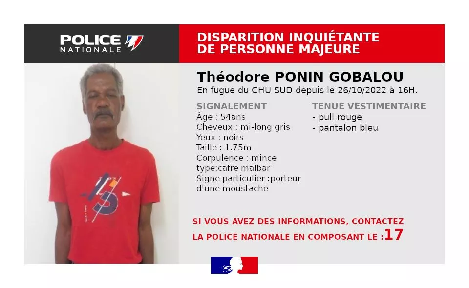 Théodore Ponin Gobalou, un homme âgé de 54 ans, a disparu depuis mercredi 26 octobre au CHU de Saint-Pierre. Il a pris la fuite après avoir arraché ses perfusions. Sa famille n’a aucune nouvelle de lui depuis. Voici son signalement.
