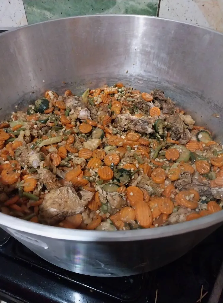 Dans les marmites ce matin : 20 kg de poulet, 15 kg de riz, 8 kg de légumes, piment, tomates et beaucoup de solidarité.