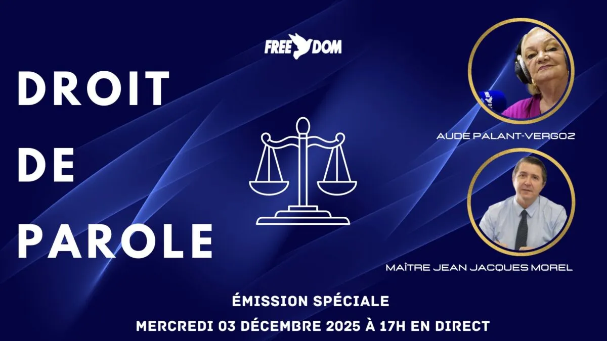 Le mercredi 3 décembre 2025 à 17 heures, l’émission « Droit de Parole », animée par Aude Palant-Vergoz sur Radio Free Dom, accueillera Maître Jean-Jacques Morel pour une nouvelle émission spéciale consacrée au droit et à la justice.