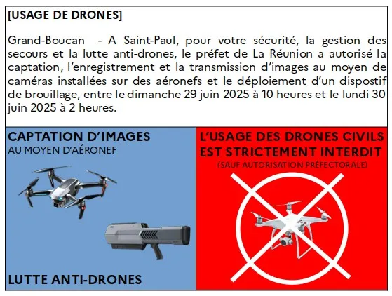 Grand-Boucan, dans le cadre de la sécurité publique, de la gestion des secours et de la lutte anti-drones, la préfecture de La Réunion a pris une mesure exceptionnelle de régulation de l’espace aérien. À l’occasion d’un événement prévu dans la commune de Saint-Paul, le préfet a autorisé la captation, l’enregistrement et la transmission d’images à l’aide de caméras embarquées sur des aéronefs, ainsi que la mise en œuvre d’un dispositif de brouillage.