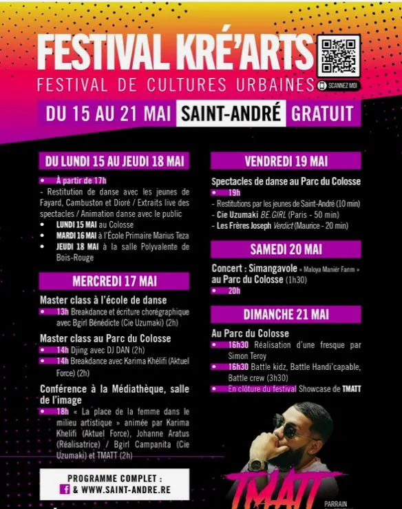 Ce sera la 3ème édition du Festival de Cultures Urbaines « FESTIVAL KRE’ARTS ». Il aura lieu au Parc du Colosse à Saint-André.