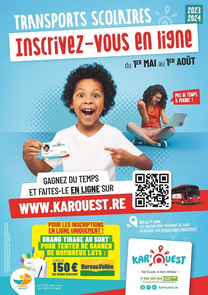 La période d’inscription pour l’année 2023-2024 a débuté. Avec plus de 17 000 dossiers d’inscription chaque année en gestion, KAR’OUEST informe tous les usagers du Territoire de la Côte Ouest de l’ouverture des inscriptions aux transports scolaires. Vous avez jusqu’au 1er août 2023.