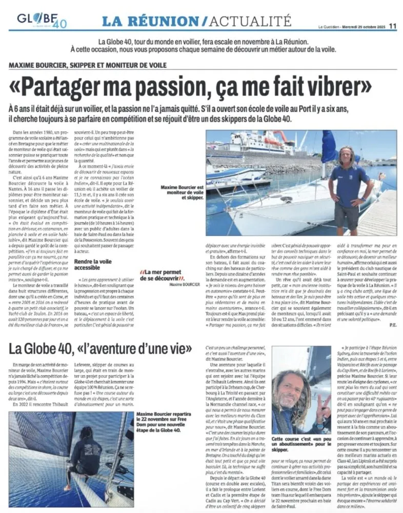 Dans les colonnes du Quotidien, Maxime Bourcier, skipper et moniteur de voile, partage sa passion et son aventure exceptionnelle à bord du bateau Free Dom pour la Globe 40.