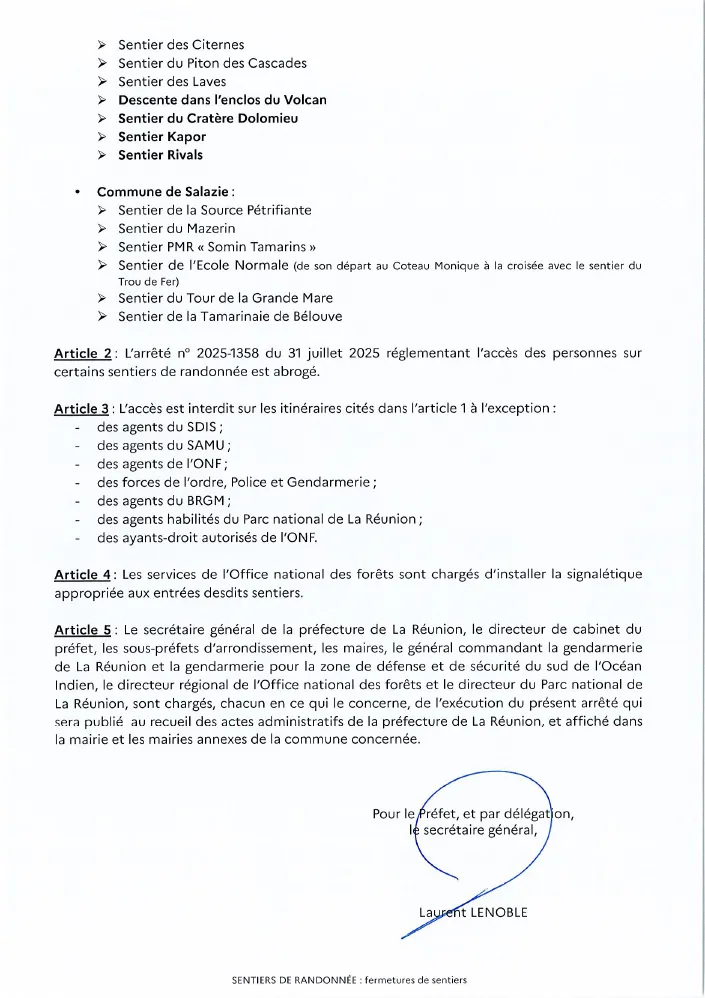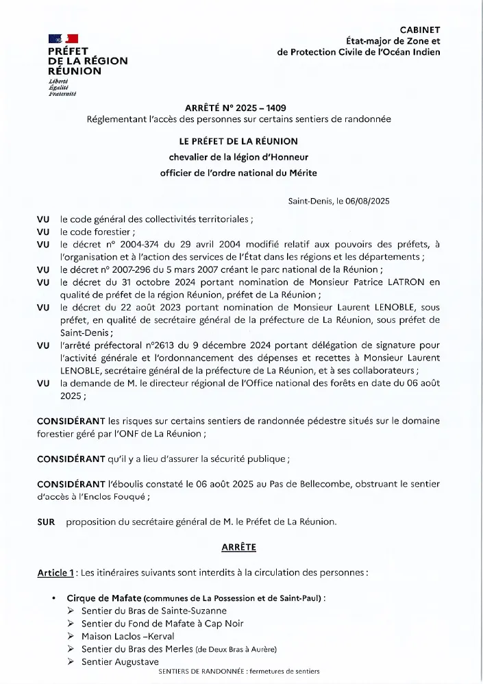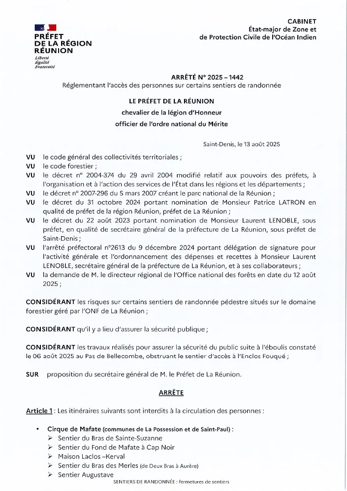 Dans ce contexte, le préfet de La Réunion a pris un arrêté interdisant l’accès à l’enclos du volcan jusqu’à nouvel ordre, interdisant la pratique des sentiers suivants : descente dans l’enclos du Volcan, sentier du Cratère Dolomieu, sentier Kapor et sentier Rivals.