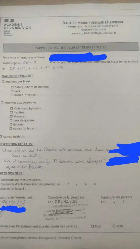 La situation a pris une tournure encore plus personnelle lorsqu’une mère a alerté l’inspection académique. Depuis cet événement, elle rapporte un sentiment d’acharnement sur ses enfants. Les deux garçons, qui s’étaient plaints d’intimidation, se verraient maintenant traités de menteurs par certains membres du personnel. L’un d’eux, retrouvé en pleurs, a raconté avoir été mis en retrait dans une autre classe sans que ses leçons pour le lendemain ne lui soient transmises.