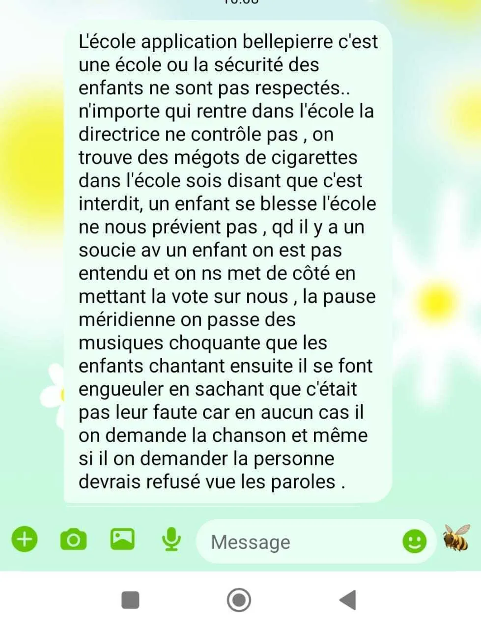 « Il y a plein de cas comme ça qui se passe dans cette cour d’école. Nous essayons d’alerter le rectorat sur ces agissements et comportements de la directrice mais elle est protégée au rectorat. »