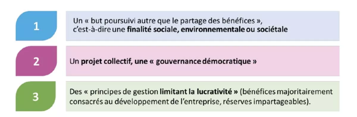 Dans la loi-cadre du 31 juillet 2014, l’Économie Sociale et Solidaire est définie comme un mode d’entreprendre dont les structures remplissent les conditions cumulatives suivantes :