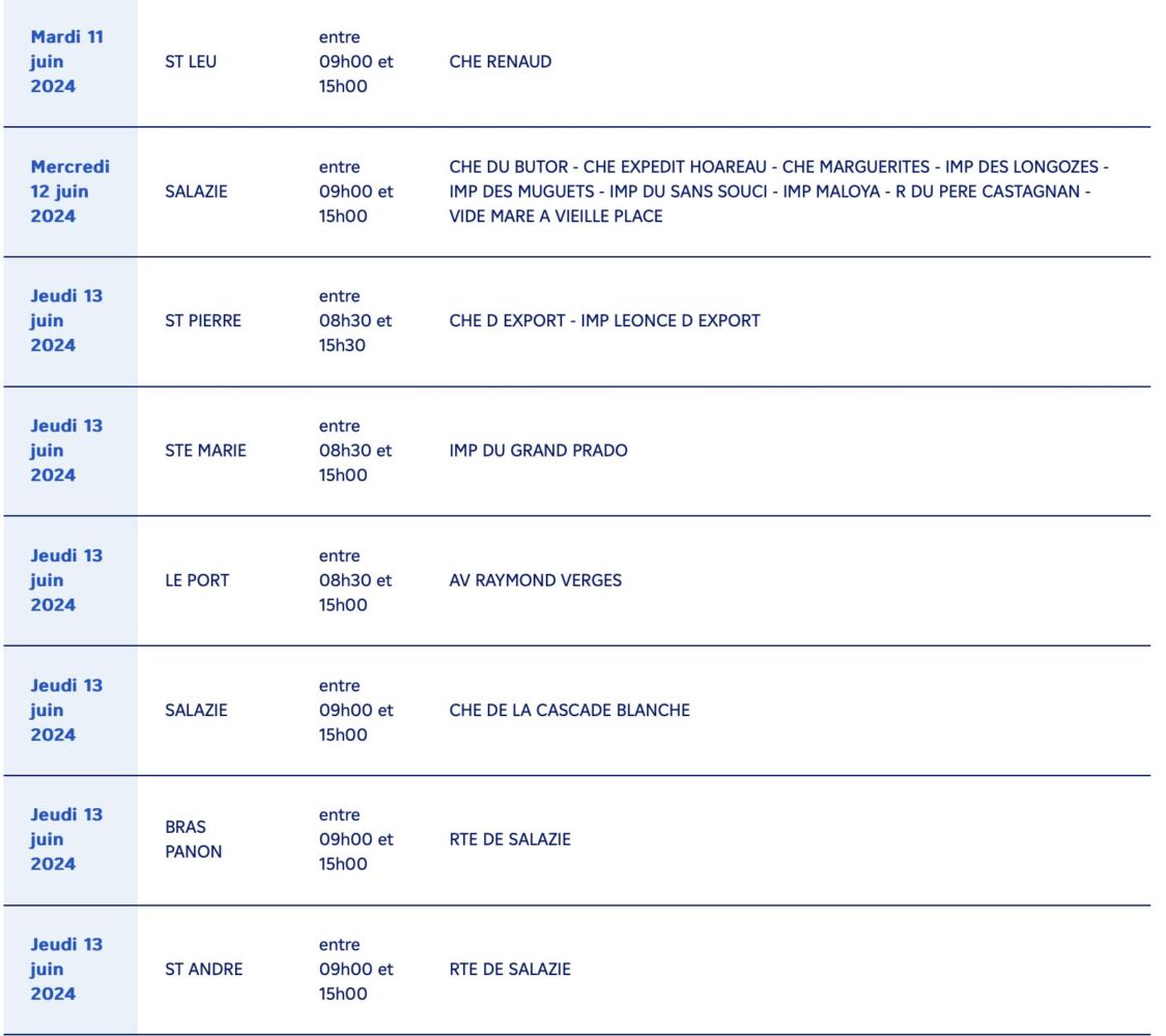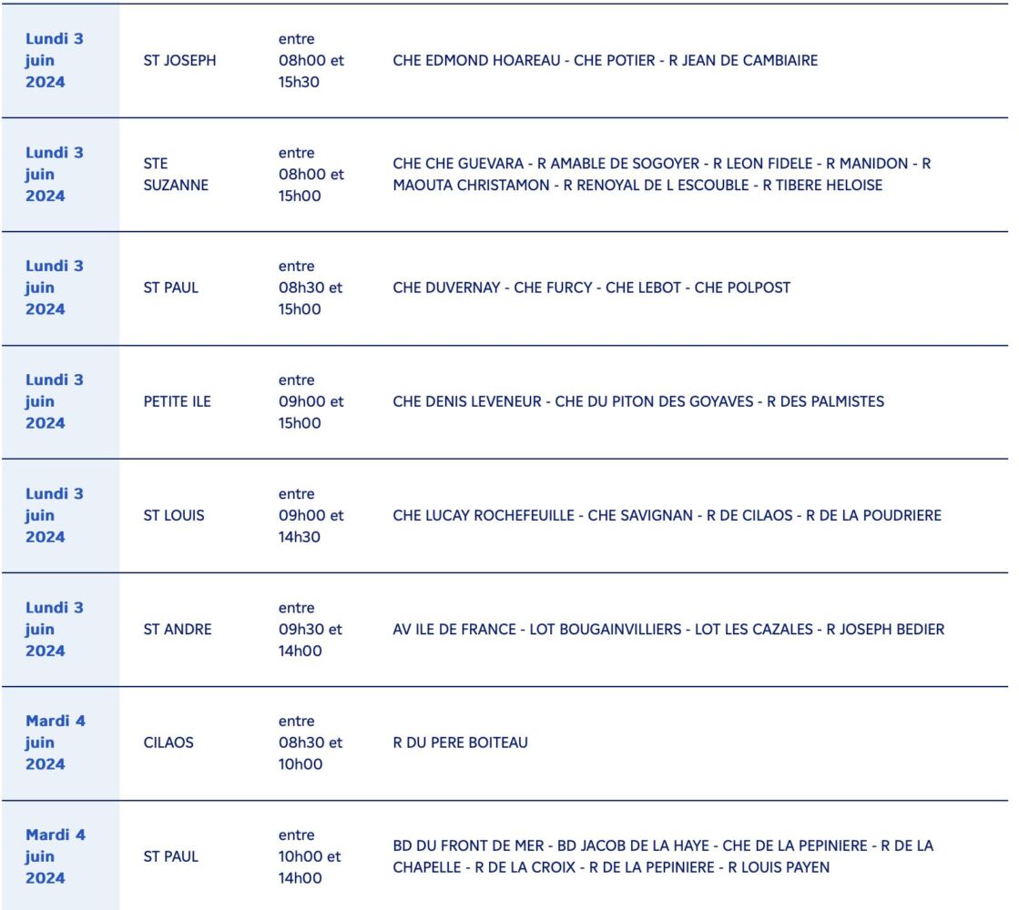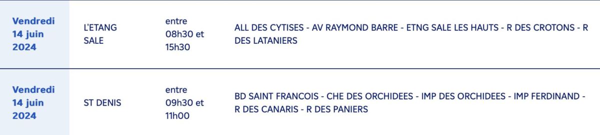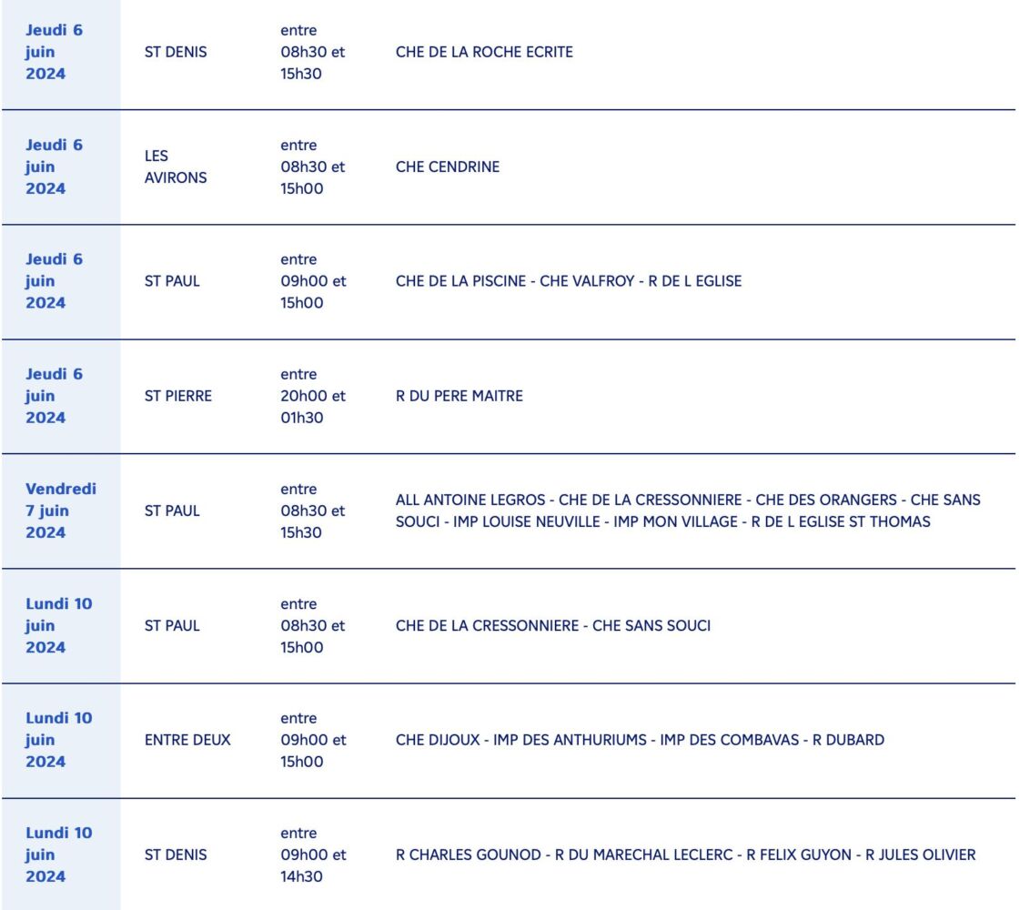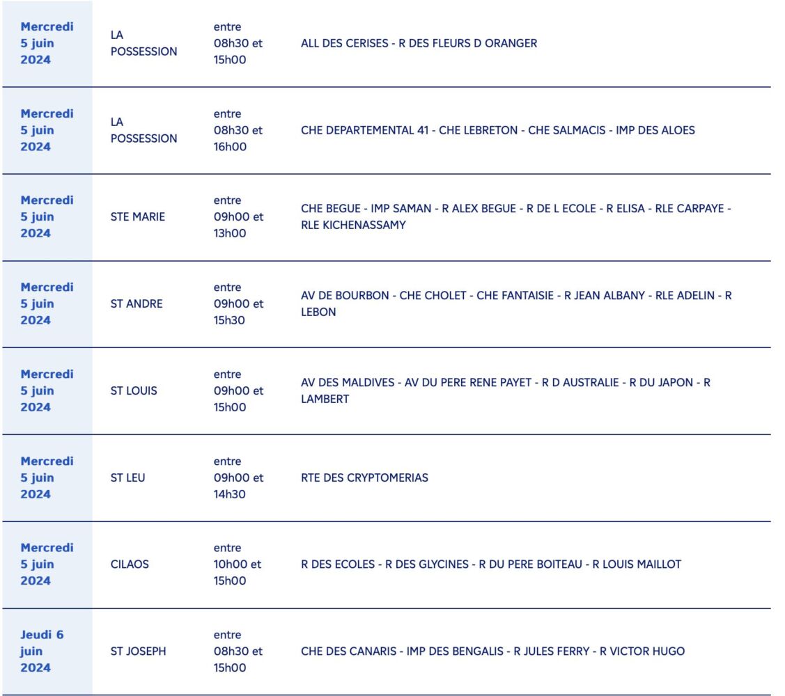 Actualités EDF à la Réunion, calendrier des coupures d’électricité pour travaux du 03 au 14 juin 2024 par Guillaume Martin 3 juin 2024 1 min de lecture 2 EDF à la Réunion informe tous ses clients des communes suivantes, qu’ils seront concernés par une coupure d’électricité pour travaux du 03 au 14 juin 2024 : Ne manquez pas toute l’actualité de La Réunion ! Abonnez-vous à la newsletter de Free Dom ! Valider Partager Facebook Twitter Pinterest Linkedin Whatsapp Reddit Email Vous pourriez être intéressé par 2 janvier 2026 1 janvier 2026 Jeudi 1ᵉʳ janvier 2026 – Météo, éphéméride et horoscope du jour 31 décembre 2025 Mercredi 31 décembre 2025 – Météo, éphéméride et horoscope du jour Guillaume Martin 2 Commentaires Merci beaucoup pour ces infos … Répondre Signaler un commentaire même avec une loupe ont n’arrive pas à la lire la liste Répondre Signaler un commentaire Laisser un commentaire Annuler la réponseYour email address will not be published. Enregistrer mon nom, mon e-mail et mon site dans le navigateur pour mon prochain commentaire. Current ye@r * Leave this field empty Article précédent Emmanuel Macron à l’antenne : Les raisons de son allocution du 6 juin Article suivant Restrictions nocturnes de circulation sur la RN1 entre St-Paul et le Port pour travaux du 3 au 6 juin Articles récents... Jeudi 1ᵉʳ janvier 2026 – Météo, éphéméride et horoscope du jour Mercredi 31 décembre 2025 – Météo, éphéméride et horoscope du jour Hommage à Johnny Hallyday sur Free Dom 2 ce 5 décembre Mardi 30 décembre 2025 – Météo, éphéméride et horoscope du jour Saint-Joseph : découverte de 2337 plants de cannabis, arrestation de 2 individus Point sur le réseau routier départemental, 29 décembre à 16H30 Suicide sur le pont de la Rivière d’Abord : importante mobilisation des secours et des forces de l’ordre Radier submergé à Ilet Furcy : la route de Cilaos fermée à la circulation cette nuit Fortes pluies : appel à la plus grande prudence à Saint-Paul