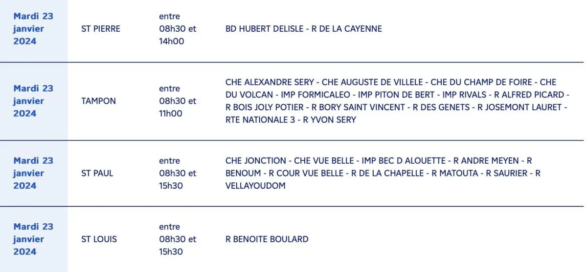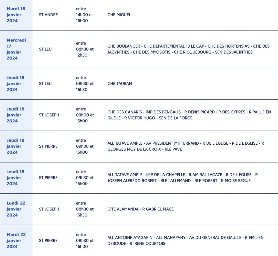 Actualités EDF à la Réunion: Info coupures d’électricité pour travaux du 15 au 23 janvier 2024 par La rédaction F R 11 janvier 2024 1 min de lecture EDF à la Réunion informe tous ses clients des communes suivantes, qu’ils seront concernés par une coupure d’électricité pour travaux : Ne manquez pas toute l’actualité de La Réunion ! Abonnez-vous à la newsletter de Free Dom ! Valider Partager Facebook Twitter Pinterest Linkedin Whatsapp Reddit Email Vous pourriez être intéressé par 1 janvier 2026 Jeudi 1ᵉʳ janvier 2026 – Météo, éphéméride et horoscope du jour 31 décembre 2025 Mercredi 31 décembre 2025 – Météo, éphéméride et horoscope du jour 30 décembre 2025 Mardi 30 décembre 2025 – Météo, éphéméride et horoscope du jour La rédaction F R Laisser un commentaire Annuler la réponseYour email address will not be published. Enregistrer mon nom, mon e-mail et mon site dans le navigateur pour mon prochain commentaire. Current ye@r * Leave this field empty Article précédent Jeudi 11 Janvier 2024 : Fêtes à souhaiter, éphéméride, journée mondiale et UNE de la Presse Article suivant Nupes et Macronie : c’est-y pas beau ça ! Articles récents... Jeudi 1ᵉʳ janvier 2026 – Météo, éphéméride et horoscope du jour Mercredi 31 décembre 2025 – Météo, éphéméride et horoscope du jour Hommage à Johnny Hallyday sur Free Dom 2 ce 5 décembre Mardi 30 décembre 2025 – Météo, éphéméride et horoscope du jour Saint-Joseph : découverte de 2337 plants de cannabis, arrestation de 2 individus Point sur le réseau routier départemental, 29 décembre à 16H30 Suicide sur le pont de la Rivière d’Abord : importante mobilisation des secours et des forces de l’ordre Radier submergé à Ilet Furcy : la route de Cilaos fermée à la circulation cette nuit Fortes pluies : appel à la plus grande prudence à Saint-Paul Saint-Gilles-les-Bains : une route impraticable, les riverains montent au créneau (VIDEOS)