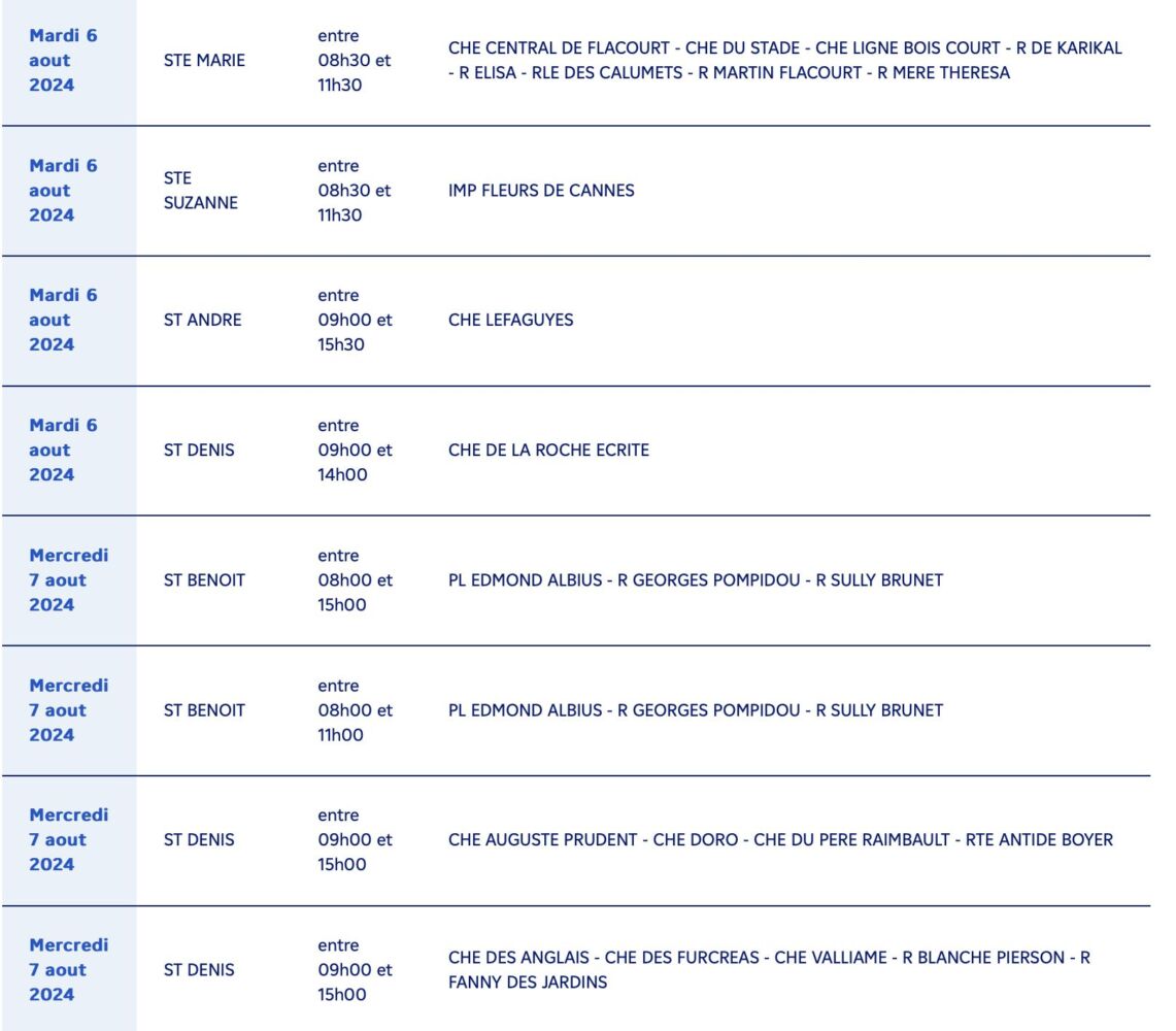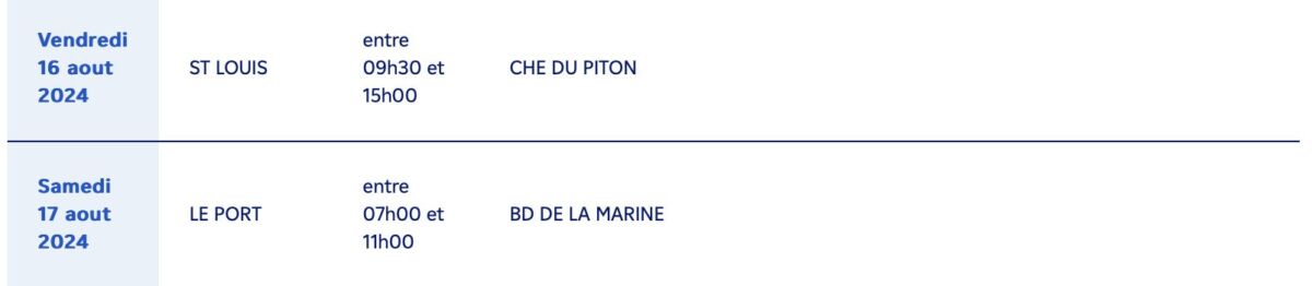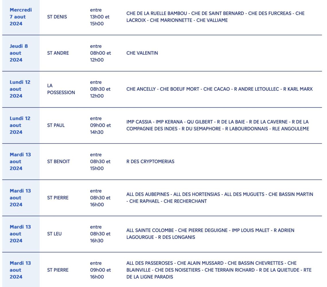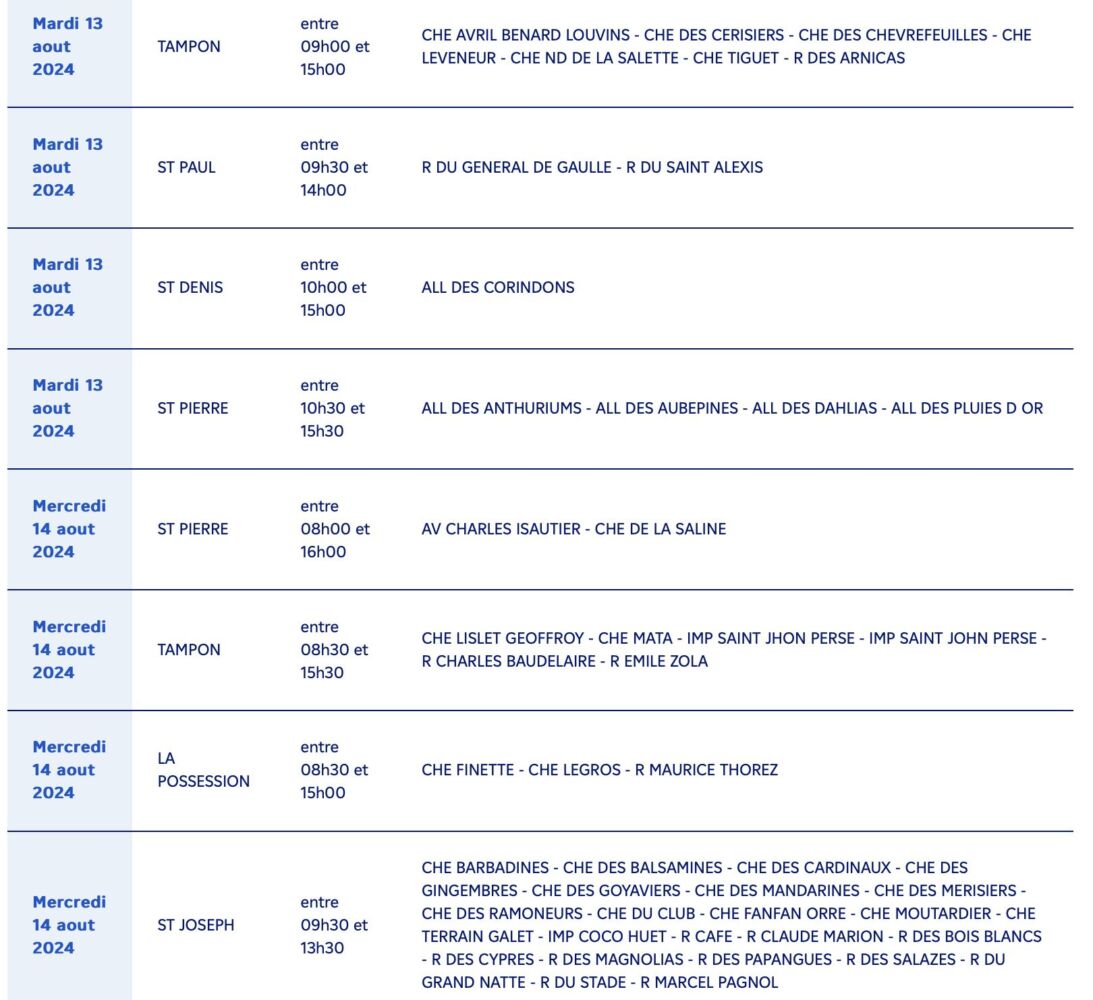 Actualités EDF Réunion, infos coupures pour travaux sur l’île du 06 au 17 août 2024 par La rédaction F R 6 août 2024 1 min de lecture EDF à La Réunion informe ses clients des communes suivantes qu’ils seront affectés par une coupure d’électricité en raison de travaux : Ne manquez pas toute l’actualité de La Réunion ! Abonnez-vous à la newsletter de Free Dom ! Valider Partager Facebook Twitter Pinterest Linkedin Whatsapp Reddit Email Vous pourriez être intéressé par 2 janvier 2026 1 janvier 2026 Jeudi 1ᵉʳ janvier 2026 – Météo, éphéméride et horoscope du jour 31 décembre 2025 Mercredi 31 décembre 2025 – Météo, éphéméride et horoscope du jour La rédaction F R Laisser un commentaire Annuler la réponseYour email address will not be published. Enregistrer mon nom, mon e-mail et mon site dans le navigateur pour mon prochain commentaire. Current ye@r * Leave this field empty Article précédent Madagascar : intoxication alimentaire, 5 morts dont une fillette de 15 mois après avoir mangé une tortue marine Article suivant 14 nouveaux membres intégrés lors de la troisième session d’engagement des sapeurs-pompiers volontaires de l’année Articles récents... Jeudi 1ᵉʳ janvier 2026 – Météo, éphéméride et horoscope du jour Mercredi 31 décembre 2025 – Météo, éphéméride et horoscope du jour Hommage à Johnny Hallyday sur Free Dom 2 ce 5 décembre Mardi 30 décembre 2025 – Météo, éphéméride et horoscope du jour Saint-Joseph : découverte de 2337 plants de cannabis, arrestation de 2 individus Point sur le réseau routier départemental, 29 décembre à 16H30 Suicide sur le pont de la Rivière d’Abord : importante mobilisation des secours et des forces de l’ordre Radier submergé à Ilet Furcy : la route de Cilaos fermée à la circulation cette nuit Fortes pluies : appel à la plus grande prudence à Saint-Paul