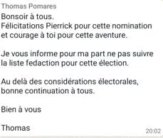 D’autres élus devront suivre le mouvement et rejoindre Pascal Plante, plutôt que Pierrick Robert, le candidat choisi par Ibrahim Patel pour conduire la liste Fédaction/Capeb. Mercredi soir, sur le groupe Whats App, Ibrahim Patel avait écrit à son groupe : « Bsr, après réflexion, je vous informe que c’est Pierrick qui porteras (avec un s) la liste pour les élections ccir Fedaction/Capeb. Amitiés ».