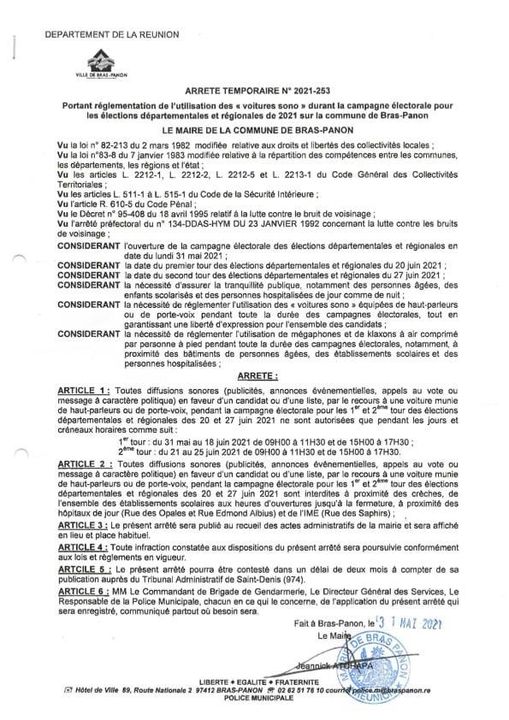 Voici l’arrêté portant règlementation de l’utilisation des « voitures sono » durant la campagne élecorale pour les élections départementales et régionales de 2021 sur la commune de Bras Panon :