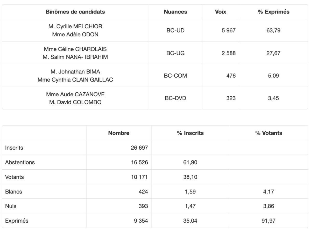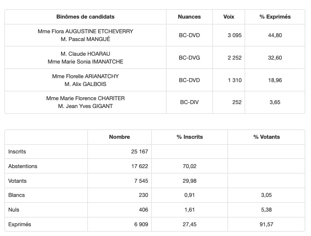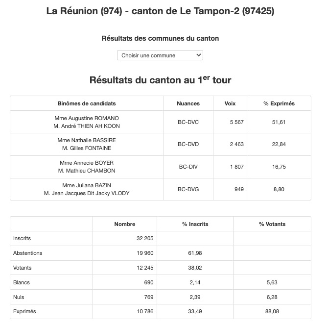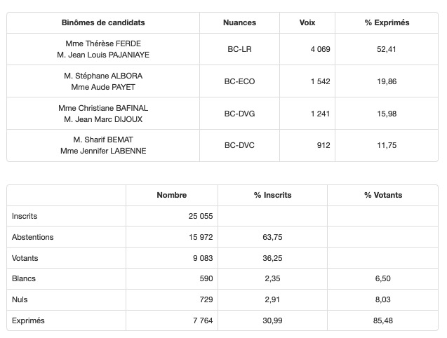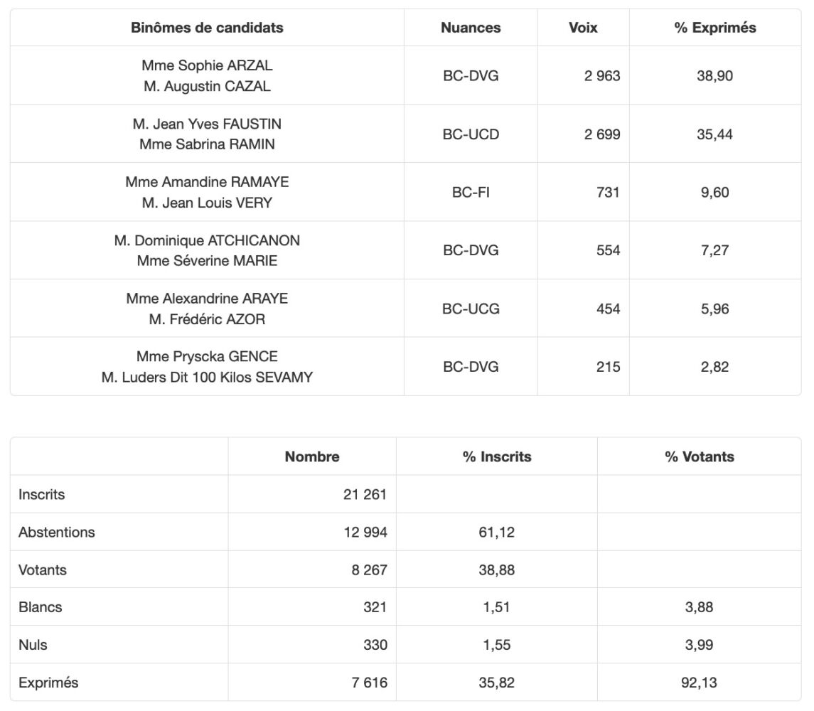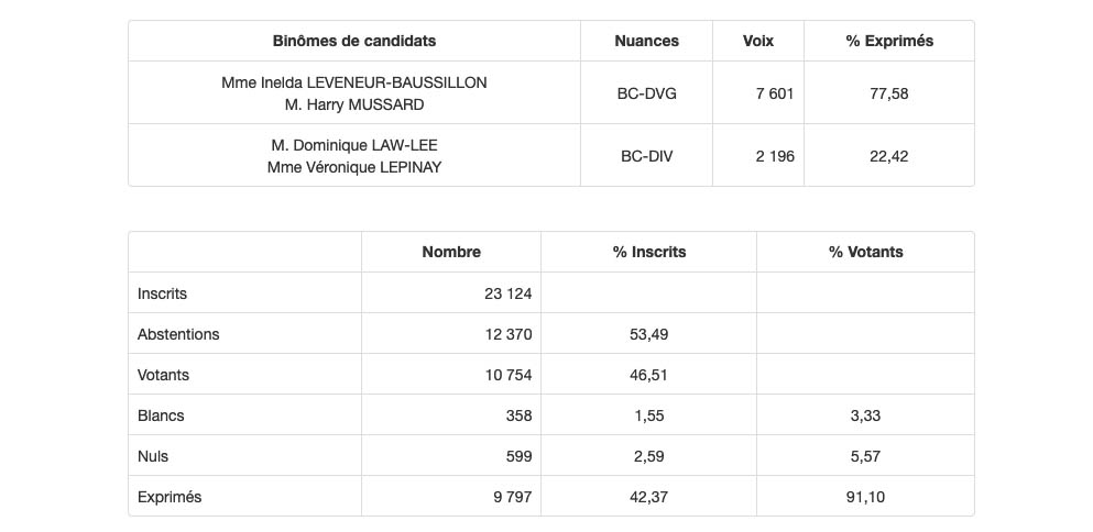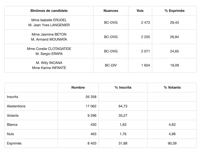 • Canton 13 (St-Joseph) : Beaussillon/Mussard élus avec 77,58% des voix