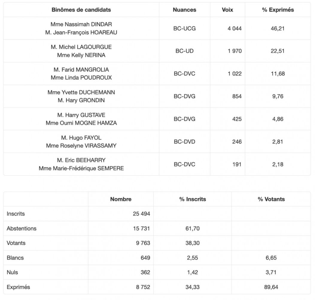 • Canton 10 (St-Denis 2) : la sortante Nassimah Dindar contrainte à un second tour