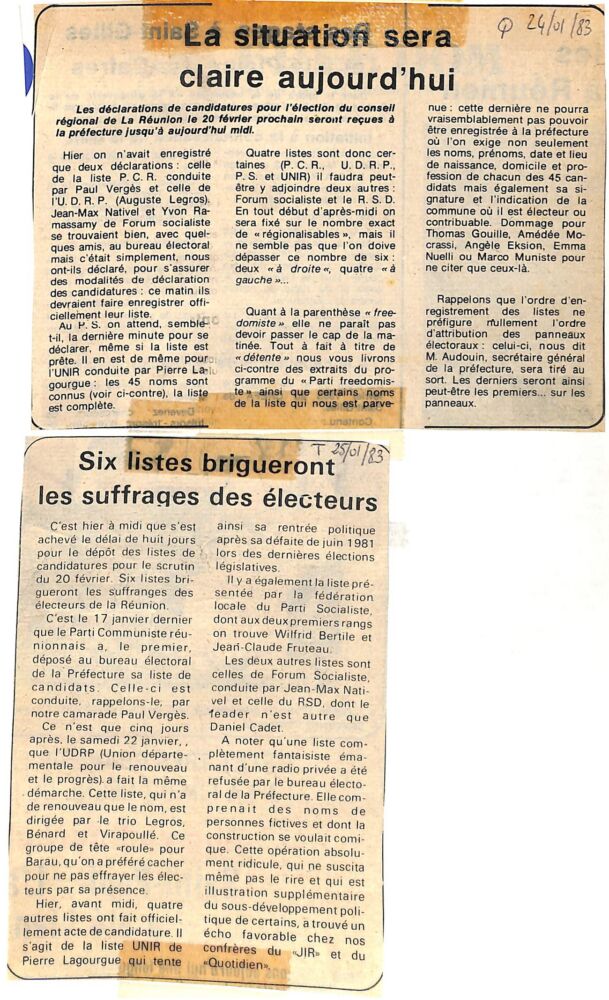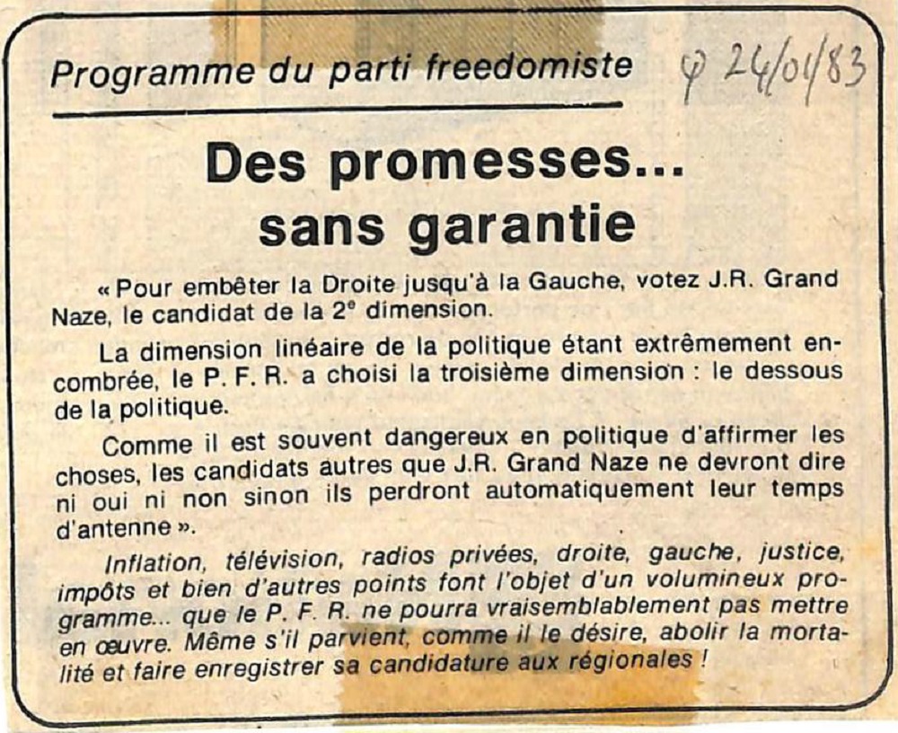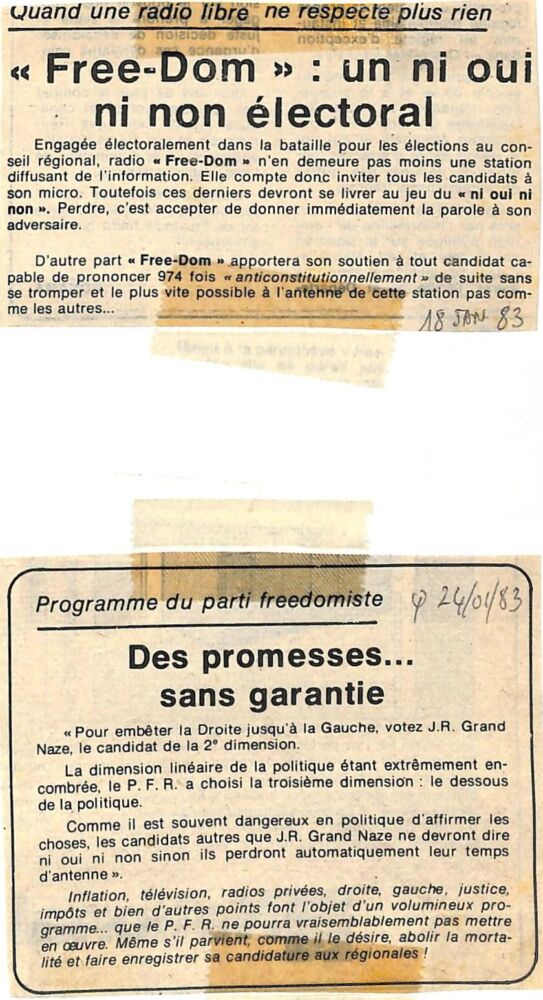 Le canular de Free Dom (une liste aux élections régionales) est semble-t-il mal apprécié par Témoignages qui écrit « une liste complètement fantaisiste émanant d’une radio privée et comportant des noms de personnes fictives et dont la construction se voulait comique. » « Cette opération absolument ridicule qui ne suscita même pas le rire et qui est une illustration supplémentaire du sous-développement politique de certains, a trouvé un écho favorable chez nos confrères du JIR et du Quotidien. »