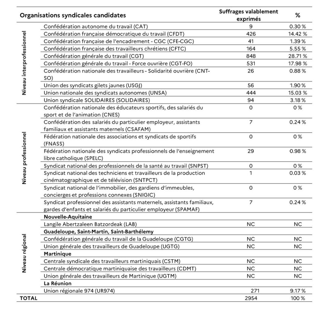 Les résultats de ce scrutin contribuent également à la mesure de l’audience des organisations syndicales. Ils s’ajoutent aux résultats des élections professionnelles (CSE) organisées dans les entreprises d’au moins 11 salariés, ainsi qu’aux élections aux chambres départementales d’agriculture.
