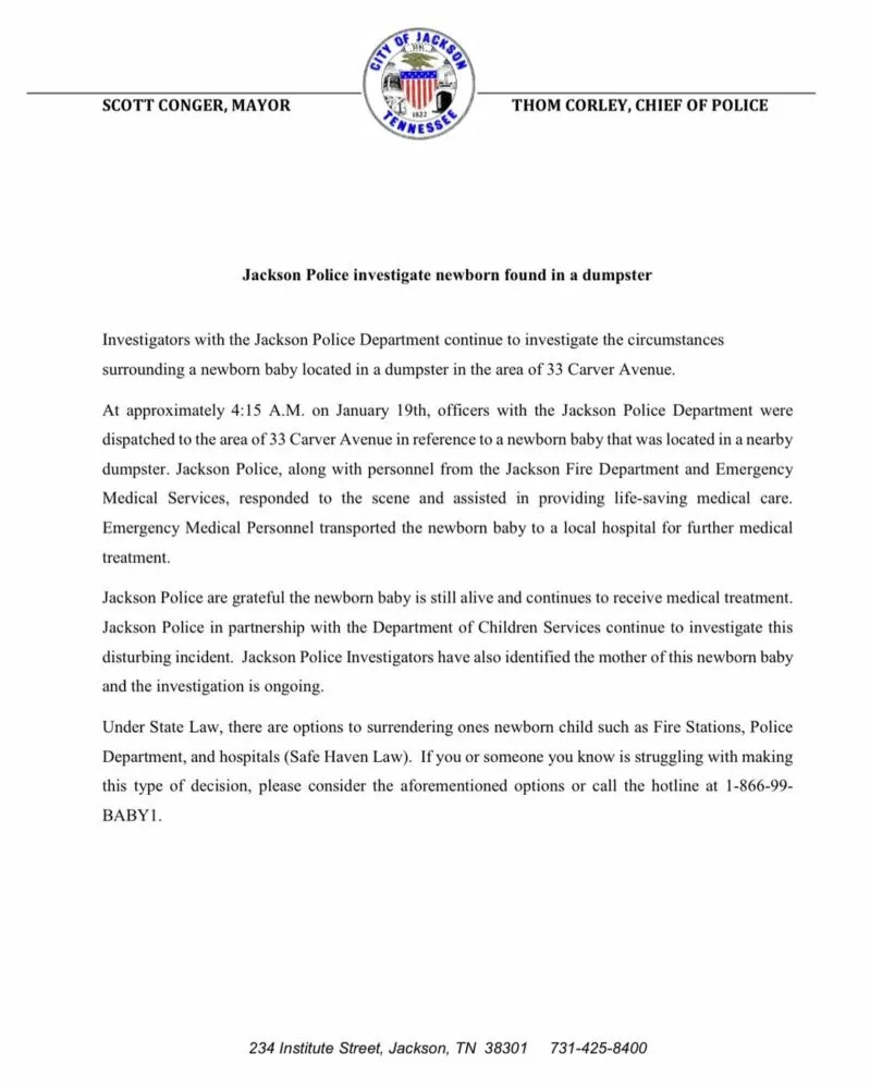 Le jeudi 19 janvier 2023, le service de police de la ville de Jackson a reçu un appel d’une personne signalant la présence d’un bébé dans une benne à ordures.