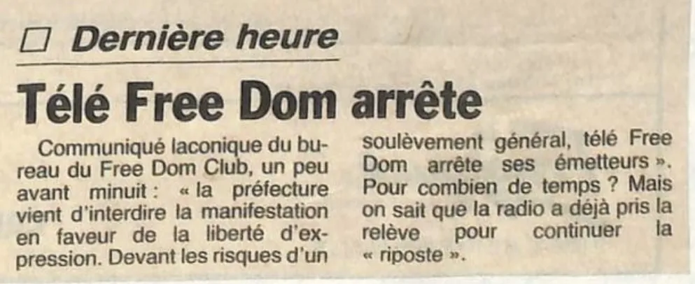 Les appels au calme se multiplient ces derniers temps à la suite des émeutes en France. En février 1991, dans le cadre des émeutes Free Dom,  elleavait coupé ses émissions, sa télé et sa radio, pour que les gens ne puissent pas appeler à la violence sur l’antenne.  Ce, malgré un système corrompu généralisé (procureur, élus, chefs d’entreprise…) que la station dénonçait