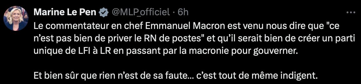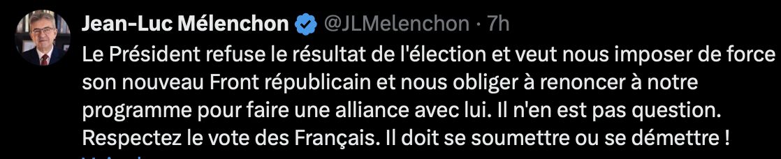 13. Celui qui a perdu, c’est le Président! Il n’a pas de majorité et doit démissionnner! Il n’a pas de leçons à donner aux Français ni aux autres partis! Il doit remettre sa démission! La France est ingouvernable et il doit impérativement donner sa démission! C’est ce que le peuple attend après les Jeux Olympiques! On lui donnera une médaille en choclat pour sa bravoure! Il pourra pleurer dans les jupons de sa maman Brigitte et faire une grosse colère! La crise oedipienne n’est pas trop loin! Il faut arrêter les enfantillages!