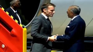 Le président français Emmanuel Macron est arrivé à l’aéroport international de Plaisance pour une visite officielle de deux jours. Les autorités mauriciennes ont accueilli la délégation française sur le tarmac : https://fb.watch/DuI3JTgs94/