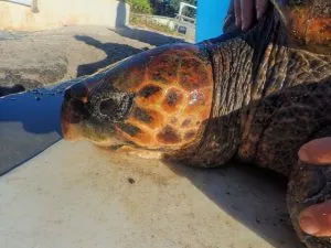 Cette tortue caouanne récupérée par Kelonia avec un hameçon et un importante blessure sur la carapace, a une place particulière dans l’histoire du centre de soins. La colonne vertébrale brisée, elle était restée 12 mois sans se nourrir et une occlusion intestinale a failli une seconde fois lui couter la vie.