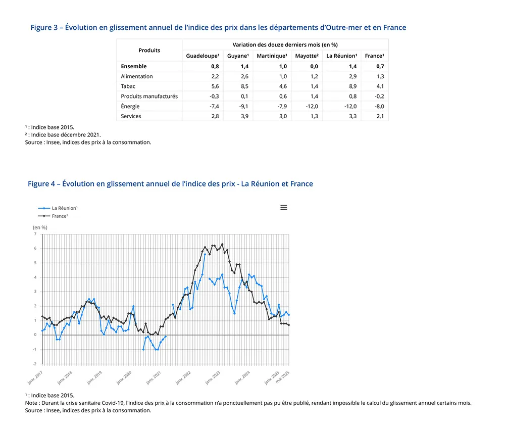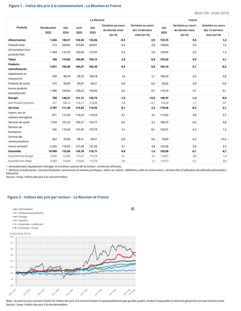 En mai 2025 à La Réunion, les prix à la consommation sont stables sur un mois et augmentent de 1,4 % sur un an