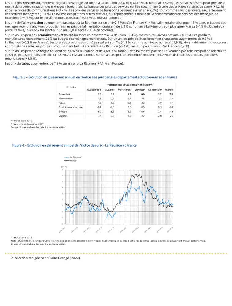 Sur un an, entre novembre 2024 et novembre 2025, les prix à la consommation augmentent de 1,2 % à La Réunion, soit davantage qu’au niveau national (+0,9 %).