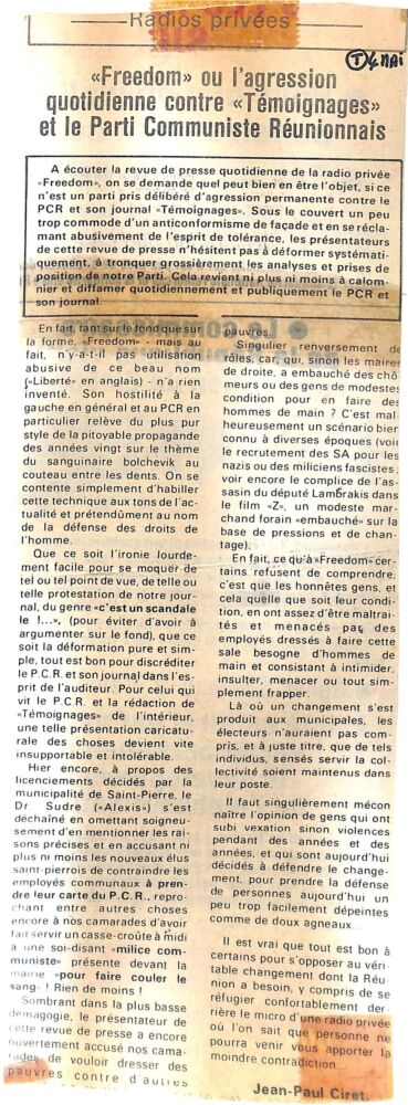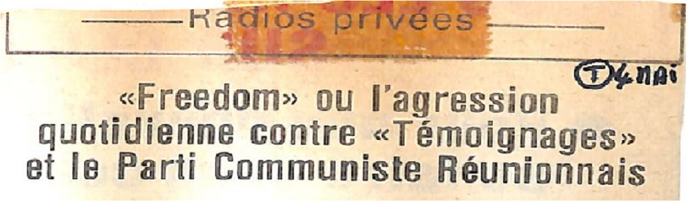 1983 Encore la polémique Free Dom – Témoignages par La Rédaction 4 mai 1983 1 min de lecture Ne manquez pas toute l’actualité de La Réunion ! Abonnez-vous à la newsletter de Free Dom ! Valider Partager Facebook Twitter Pinterest Linkedin Whatsapp Reddit Email Vous pourriez être intéressé par 10 décembre 1983 Une pub qui termine ces trois années d’existence 31 août 1983 Camille Sudre : « Le but poursuivi par Radio Free Dom : ne jamais se prendre au sérieux et ouvrir l’antenne à tous ceux qui veulent s’exprimer, sans aucune exclusive » 2 juillet 1983 Corneil Domitile gagne le concours de la chanson organisé par Radio Free Dom La Rédaction Laisser un commentaire Annuler la réponseYour email address will not be published. Enregistrer mon nom, mon e-mail et mon site dans le navigateur pour mon prochain commentaire. Current ye@r * Leave this field empty Article précédent Radios libres : la frite et la dêche Article suivant Toujours la polémique entre Alexis et Témoignages Articles récents... Hommage à Johnny Hallyday sur Free Dom 2 ce 5 décembre Mardi 30 décembre 2025 – Météo, éphéméride et horoscope du jour Saint-Joseph : découverte de 2337 plants de cannabis, arrestation de 2 individus Point sur le réseau routier départemental, 29 décembre à 16H30 Suicide sur le pont de la Rivière d’Abord : importante mobilisation des secours et des forces de l’ordre Radier submergé à Ilet Furcy : la route de Cilaos fermée à la circulation cette nuit Fortes pluies : appel à la plus grande prudence à Saint-Paul Saint-Gilles-les-Bains : une route impraticable, les riverains montent au créneau (VIDEOS) Très grands excès de vitesse : un délit passible de prison depuis le 29 décembre 2025 Fermeture temporaire du sentier de la Canalisation des Orangers (cirque de Mafate)