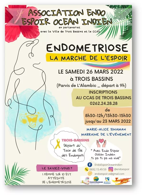 La Ville de Trois-Bassins et le CCAS accompagnent l’association Endo Espoir Océan Indien pour le lancement du « Tour de l’île des Endogirl’s » à TROIS BASSINS le Samedi 26 mars 2022 à 9h00 sur le parvis de L’Alambic (28 rue Georges Brassens 97426 Trois Bassins)
