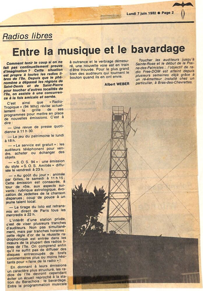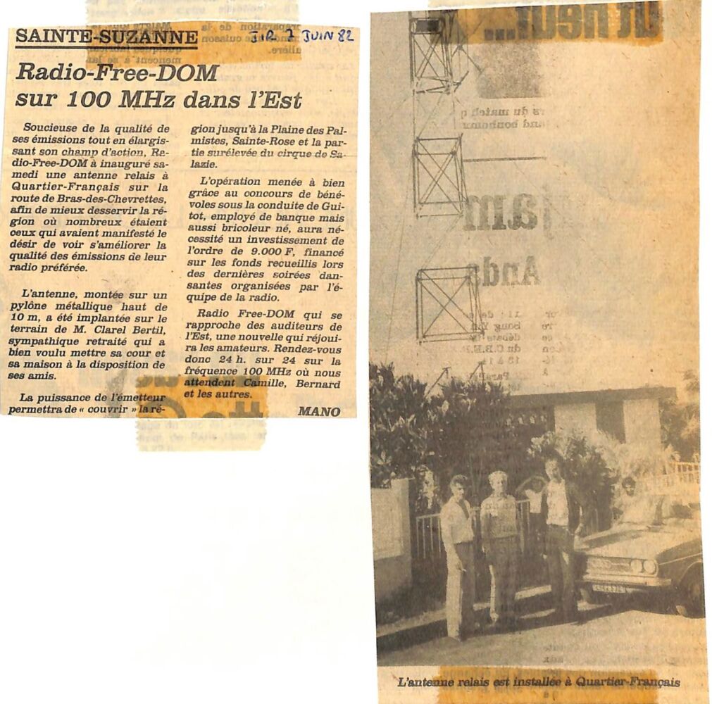 1982 Enfin le premier réémetteur dans l’Est ! par La Rédaction 7 juin 1982 1 min de lecture Sur la photo, on reconnaît Guyto et Monsieur Pouzet, technicien radio. Ne manquez pas toute l’actualité de La Réunion ! Abonnez-vous à la newsletter de Free Dom ! Valider Partager Facebook Twitter Pinterest Linkedin Whatsapp Reddit Email Vous pourriez être intéressé par 10 décembre 1982 Un canular par jour sur Radio Free Dom 11 octobre 1982 L’émission « pas de canard sans navet » 7 octobre 1982 L’émission « bleu outre-mer ou la radio de la méduse… » La Rédaction Laisser un commentaire Annuler la réponseYour email address will not be published. Enregistrer mon nom, mon e-mail et mon site dans le navigateur pour mon prochain commentaire. Current ye@r * Leave this field empty Article précédent Article musclé de Laurent Vergès (Témoignages) Article suivant Petite guéguerre entre radios libres Articles récents... Hommage à Johnny Hallyday sur Free Dom 2 ce 5 décembre Mardi 30 décembre 2025 – Météo, éphéméride et horoscope du jour Saint-Joseph : découverte de 2337 plants de cannabis, arrestation de 2 individus Point sur le réseau routier départemental, 29 décembre à 16H30 Suicide sur le pont de la Rivière d’Abord : importante mobilisation des secours et des forces de l’ordre Radier submergé à Ilet Furcy : la route de Cilaos fermée à la circulation cette nuit Fortes pluies : appel à la plus grande prudence à Saint-Paul Saint-Gilles-les-Bains : une route impraticable, les riverains montent au créneau (VIDEOS) Très grands excès de vitesse : un délit passible de prison depuis le 29 décembre 2025 Fermeture temporaire du sentier de la Canalisation des Orangers (cirque de Mafate)