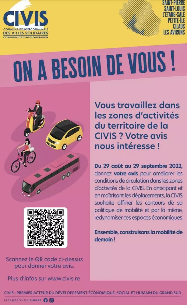 CIVIS/Collectivités Enquête « grand public » sur les conditions de circulation sur les zones d’activités de la Civis par La Rédaction 5 septembre 2022 1 min de lecture Un appel est lancé au grand public pour qu’il réponde aux questions, visant à améliorer grandement les conditions de circulation au sein des grands axes d’activité du territoire de la Civis. Ne manquez pas toute l’actualité de La Réunion ! Abonnez-vous à la newsletter de Free Dom ! Valider Partager Facebook Twitter Pinterest Linkedin Whatsapp Reddit Email Vous pourriez être intéressé par 2 décembre 2025 La CIVIS lance une campagne choc contre l’errance animale 21 novembre 2025 Plus de 49 702 tonnes de déchets collectées en 2024 : La CIVIS s’engage pour un avenir durable 21 novembre 2025 Petite-Île : grande collecte de vêtements et de petits appareils électriques, samedi 22 novembre de 8h à 14h La Rédaction Laisser un commentaire Annuler la réponseYour email address will not be published. Enregistrer mon nom, mon e-mail et mon site dans le navigateur pour mon prochain commentaire. Current ye@r * Leave this field empty Article précédent Guétali : concert gratuit du groupe La Sépia Article suivant Les chauves-souris sont à l’honneur à l’Etang de St-Paul Articles récents... Mercredi 31 décembre 2025 – Météo, éphéméride et horoscope du jour Hommage à Johnny Hallyday sur Free Dom 2 ce 5 décembre Mardi 30 décembre 2025 – Météo, éphéméride et horoscope du jour Saint-Joseph : découverte de 2337 plants de cannabis, arrestation de 2 individus Point sur le réseau routier départemental, 29 décembre à 16H30 Suicide sur le pont de la Rivière d’Abord : importante mobilisation des secours et des forces de l’ordre Radier submergé à Ilet Furcy : la route de Cilaos fermée à la circulation cette nuit Fortes pluies : appel à la plus grande prudence à Saint-Paul Saint-Gilles-les-Bains : une route impraticable, les riverains montent au créneau (VIDEOS) Très grands excès de vitesse : un délit passible de prison depuis le 29 décembre 2025